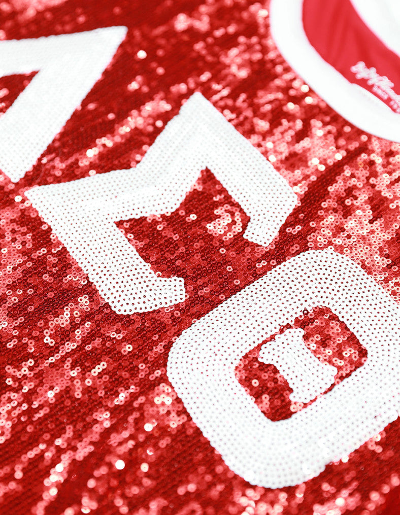 - Sequin is embroidered greek letters on front.
